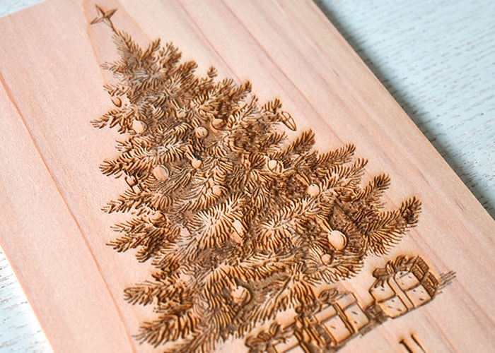 レーザー加工機で刻まれたデザインは、木そのものを「彫る」ことで、立体感のあるデザインが実現しました。木目の風合いにぴったりな、落ち着いた仕上がりが生まれます。