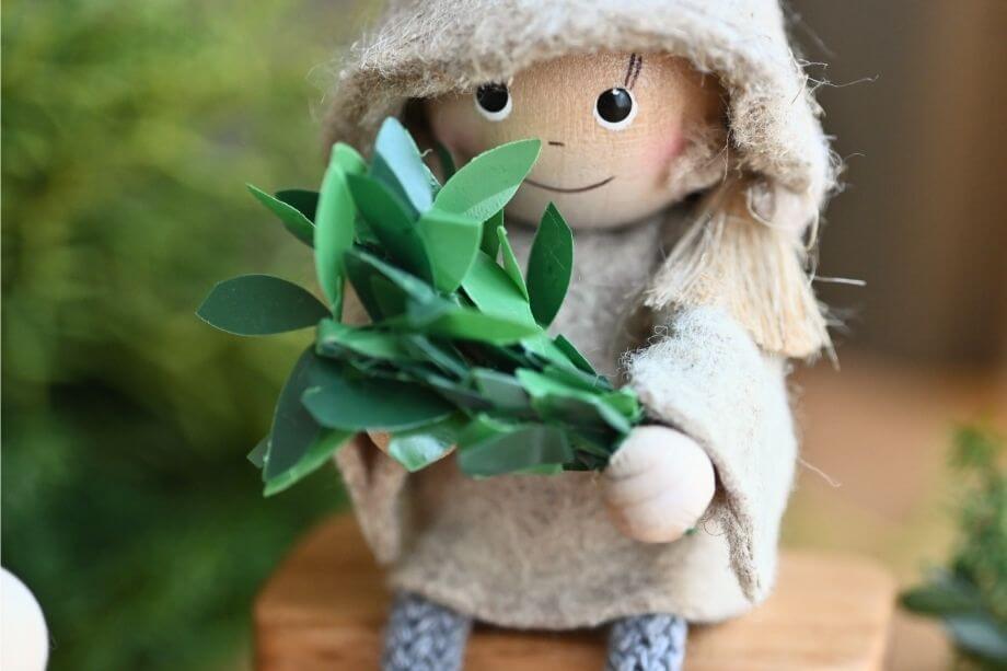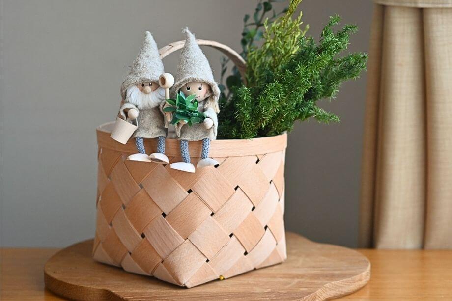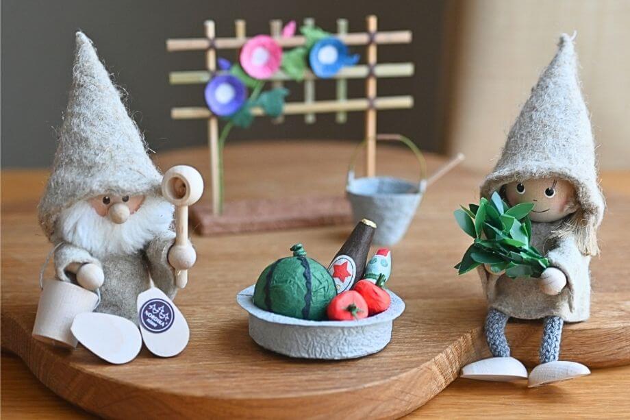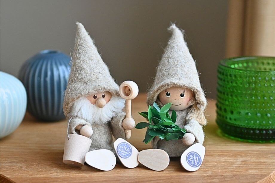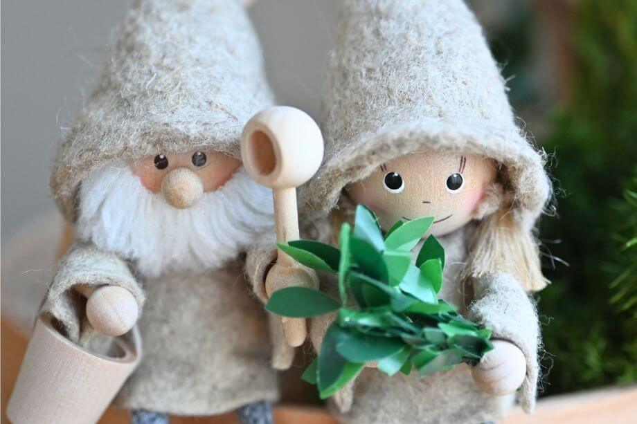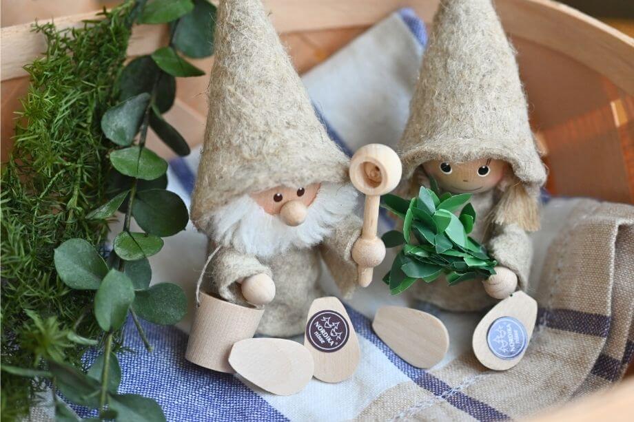 ロウリュに使う、ひしゃくとバケツを手に持ったサンタニッセと、ヴィヒタを持った女の子ニッセ。サウナをテーマにした2体のセットです。