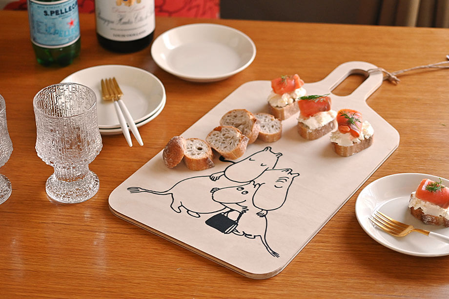 ムーミン柄のサービングボードは、立て掛けるだけでも素敵なひと品。使って飾って、大車輪の活躍です。
