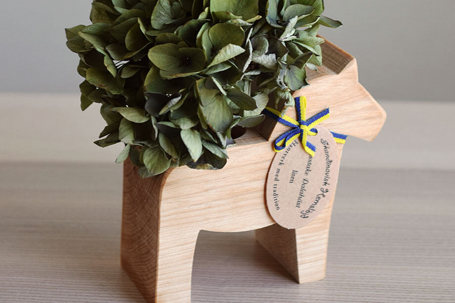 幸せを運ぶダーラヘストは、本場北欧で作られています。背中に色々なものを乗せて楽しめますよ。