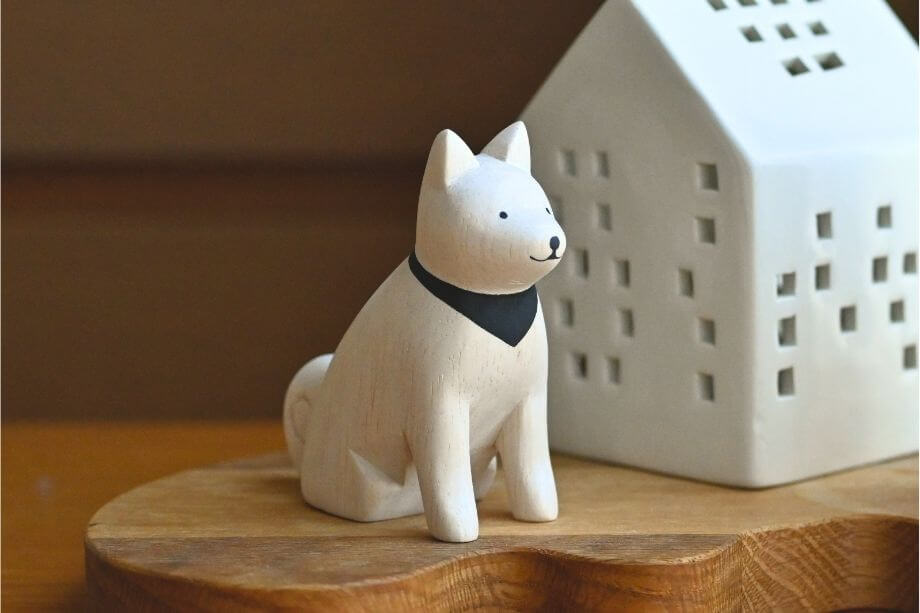 こちらは、忠犬ハチ公のようなお座りポーズが可愛すぎるアキタイヌ。狛犬風のデザインで、おうちの守り神にもピッタリです。