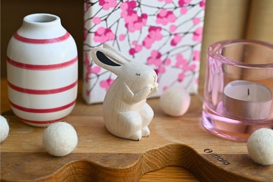 毛づくろいのようなポーズがチャーミングなウサギさん。長いお耳はお部屋のアクセントにもなります。