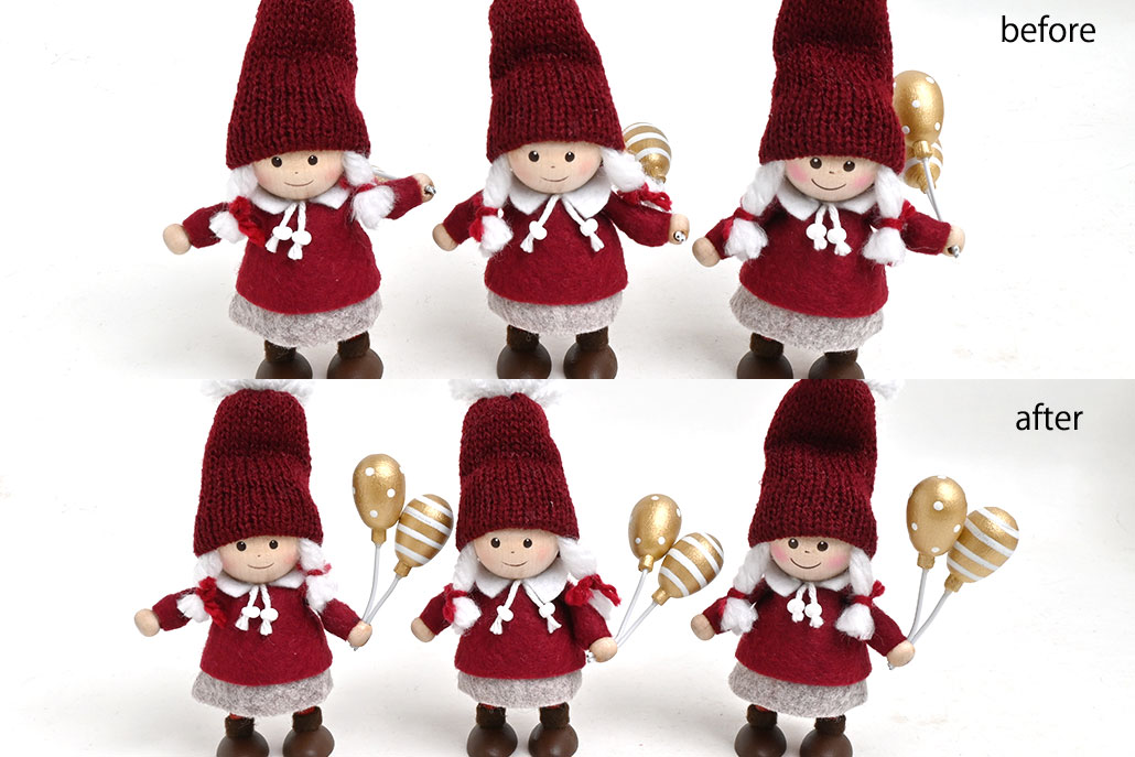 もちろん飾り方に決まりはありませんが、男の子・サンタさん・女の子と並べると、背丈のバランスだけでなく、小物の向きもしっくりとくる飾りつけになってオススメ。