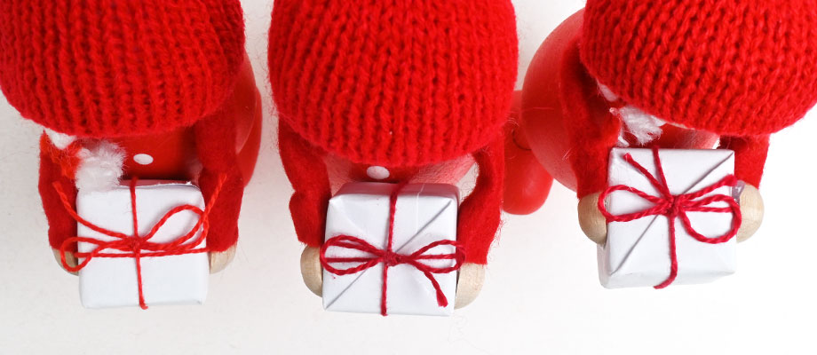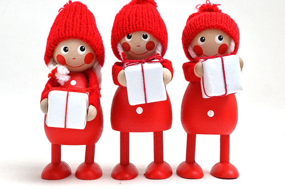 お顔や身体は木、帽子はフェルト、プレゼントは紙製など、パーツによって素材を巧みに使い分けていて、職人さんのこだわりが随所に見えるお人形になっています。